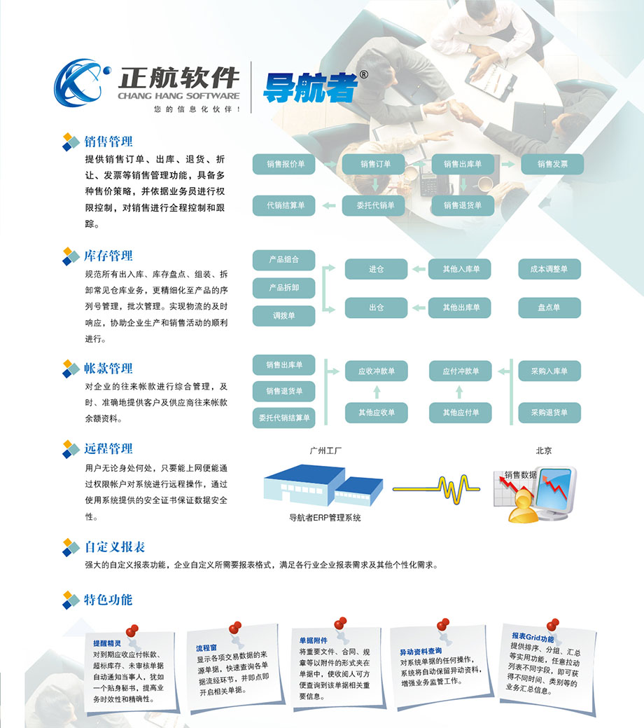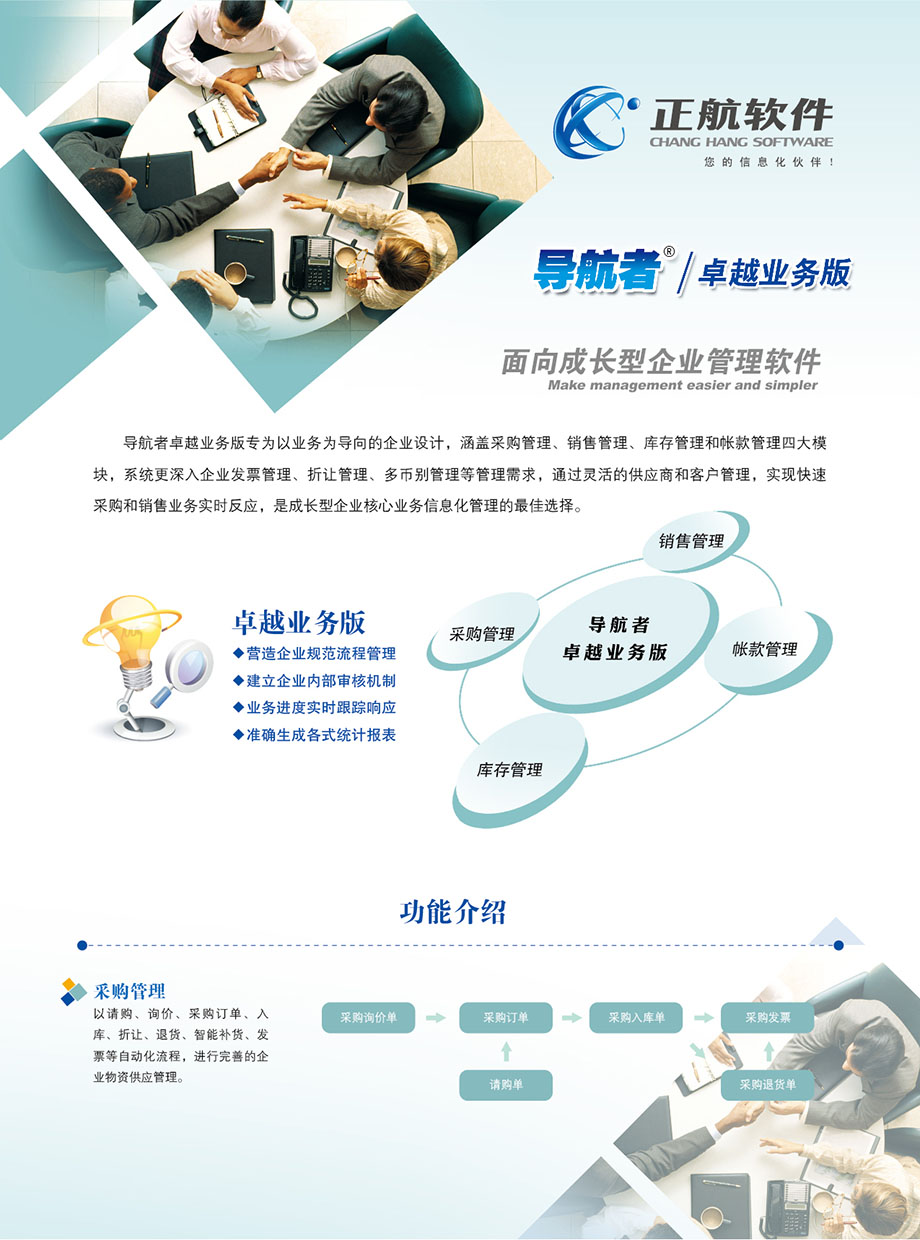 導(dǎo)航者卓越業(yè)務(wù)版專為以業(yè)務(wù)為導(dǎo)向的企業(yè)設(shè)計(jì),涵蓋采購(gòu)管理、銷售管理、庫(kù)存管理和帳款管理四大范疇,通過(guò)靈活的供應(yīng)商和客戶管理,實(shí)現(xiàn)快速采購(gòu)和銷售數(shù)據(jù)響應(yīng),是企業(yè)進(jìn)銷存信息化控管的最佳選擇。